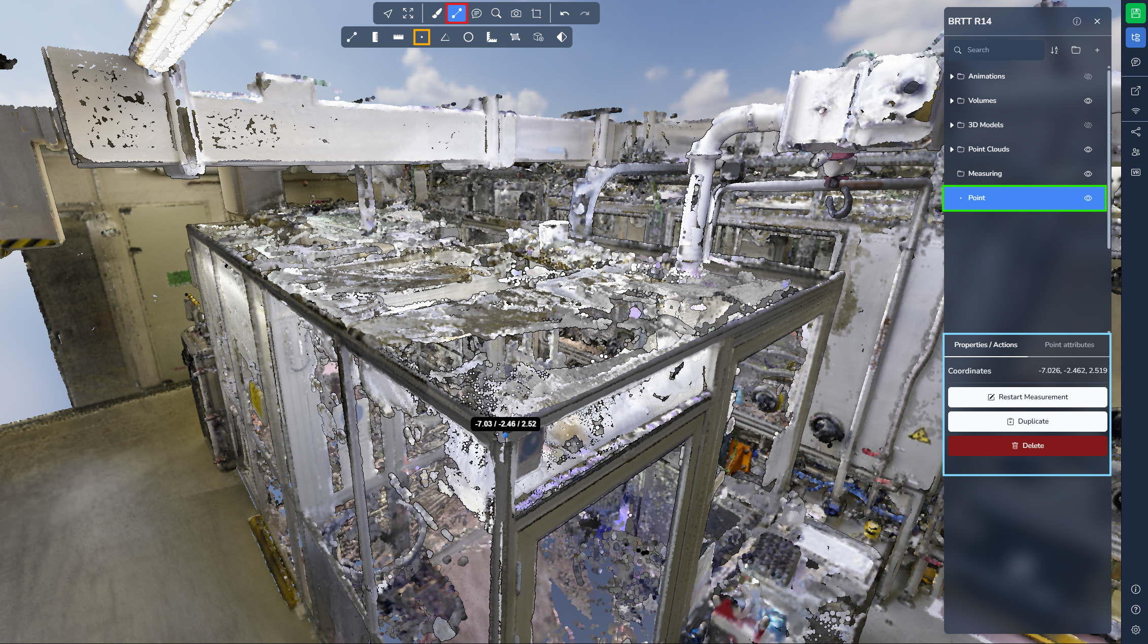 A medição ponto permite posicionar um único ponto na cena e obter suas coordenadas exatas. Esta ferramenta é particularmente útil em projetos georreferenciados onde são necessárias informações posicionais precisas.