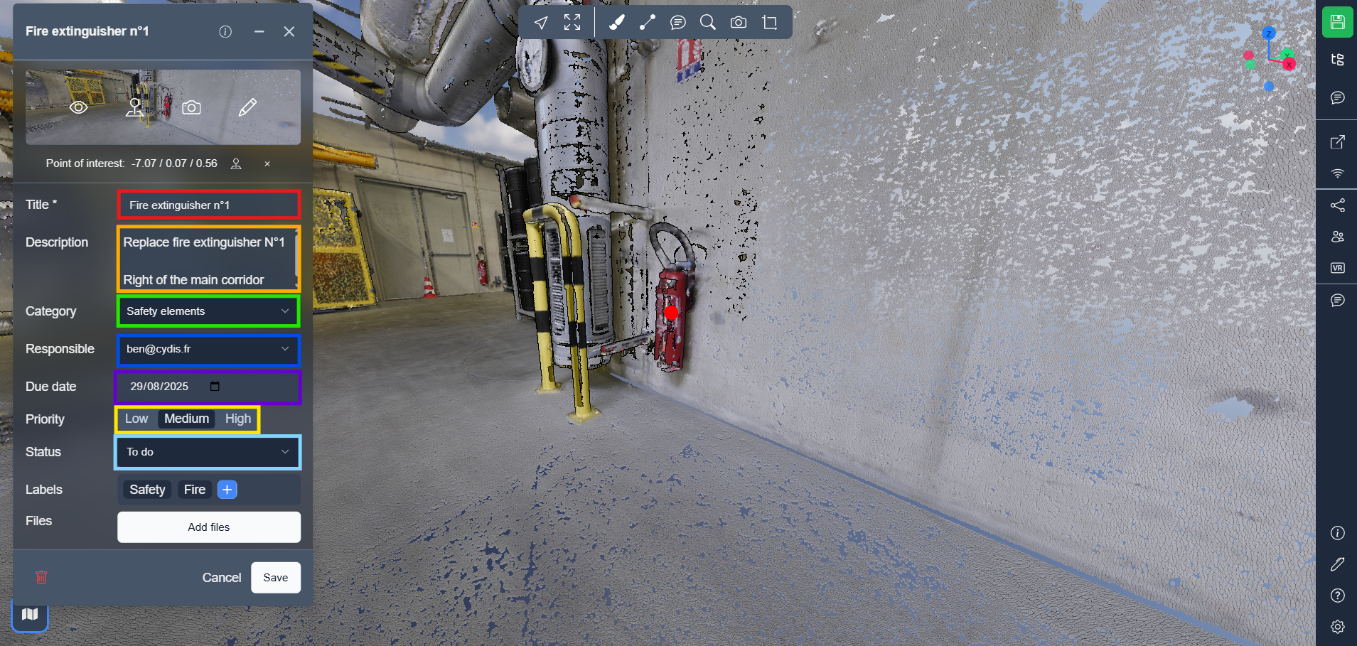 Sob a imagem, você encontrará o Ponto de interesse, que você pode ver no extintor de incêndio, um ponto vermelho. Esse ponto pode ser movido arrastando-o, ele representa a posição do elemento que você está tentando mostrar, se você não quiser que esse ponto seja mostrado, mas apenas o cone, pode pressionar a cruz para removê-lo.