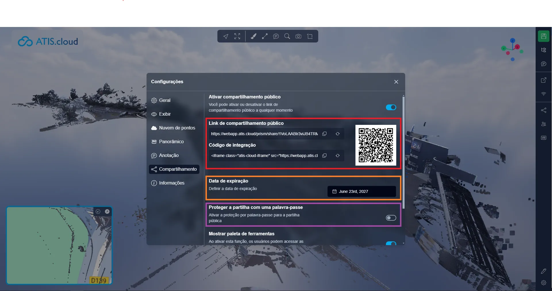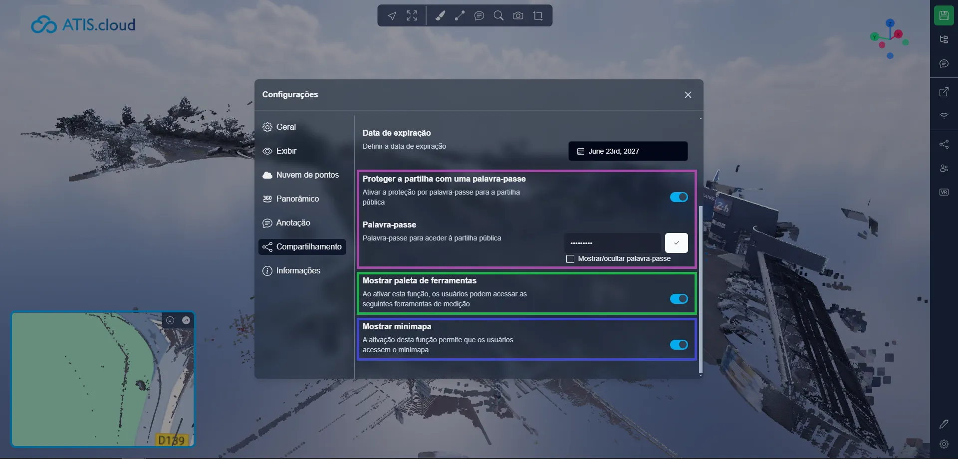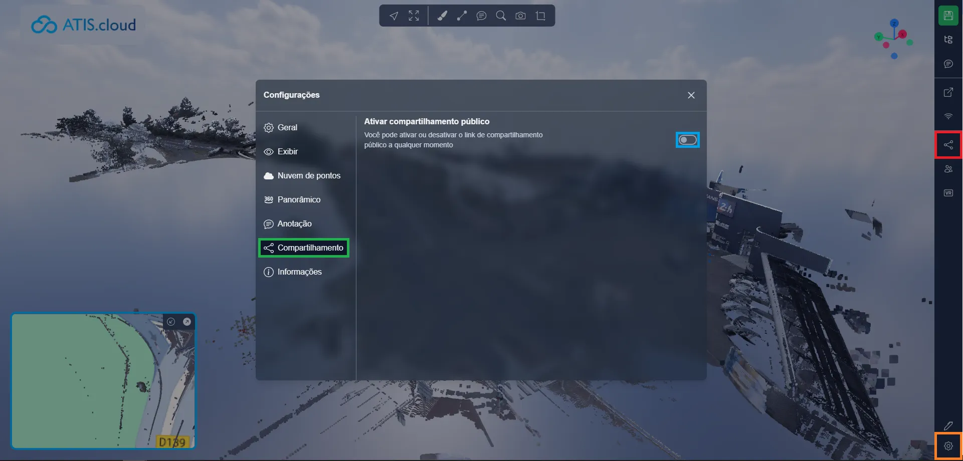 Por fim, você pode decidir ativar ou desativar o mini-mapa no compartilhamento público; desabilitar o mini-mapa não bloqueará os usuários de ativá-lo uma vez que estejam na Aplicação 3D, isso é apenas uma configuração padrão para indicar se o mapa deve ser ativado ou desativado por padrão.