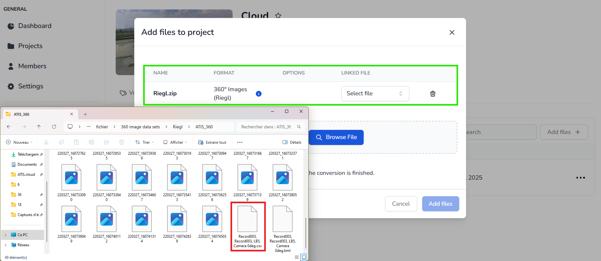 Em alguns casos, se você tiver um arquivo e57, dependendo da ferramenta usada para exportar o arquivo e57, as imagens 360° podem estar incluídas dentro. Nesse caso, a plataforma mantém as imagens 360° (por exemplo, Cyclone Register 360 mantém as imagens se o arquivo e57 estiver estruturado, e NavVis e Geoslam também mantêm as imagens no arquivo e57).