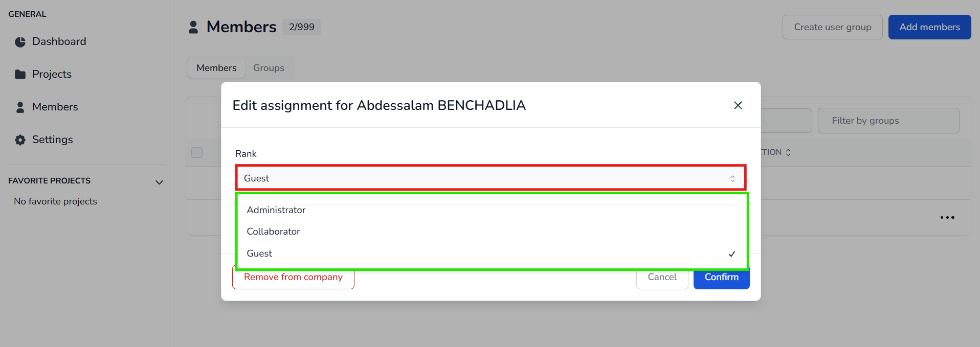 - Selecione o novo cargo que deseja atribuir (por exemplo, Admin, Gerente, Gerente de projeto ou Membro).