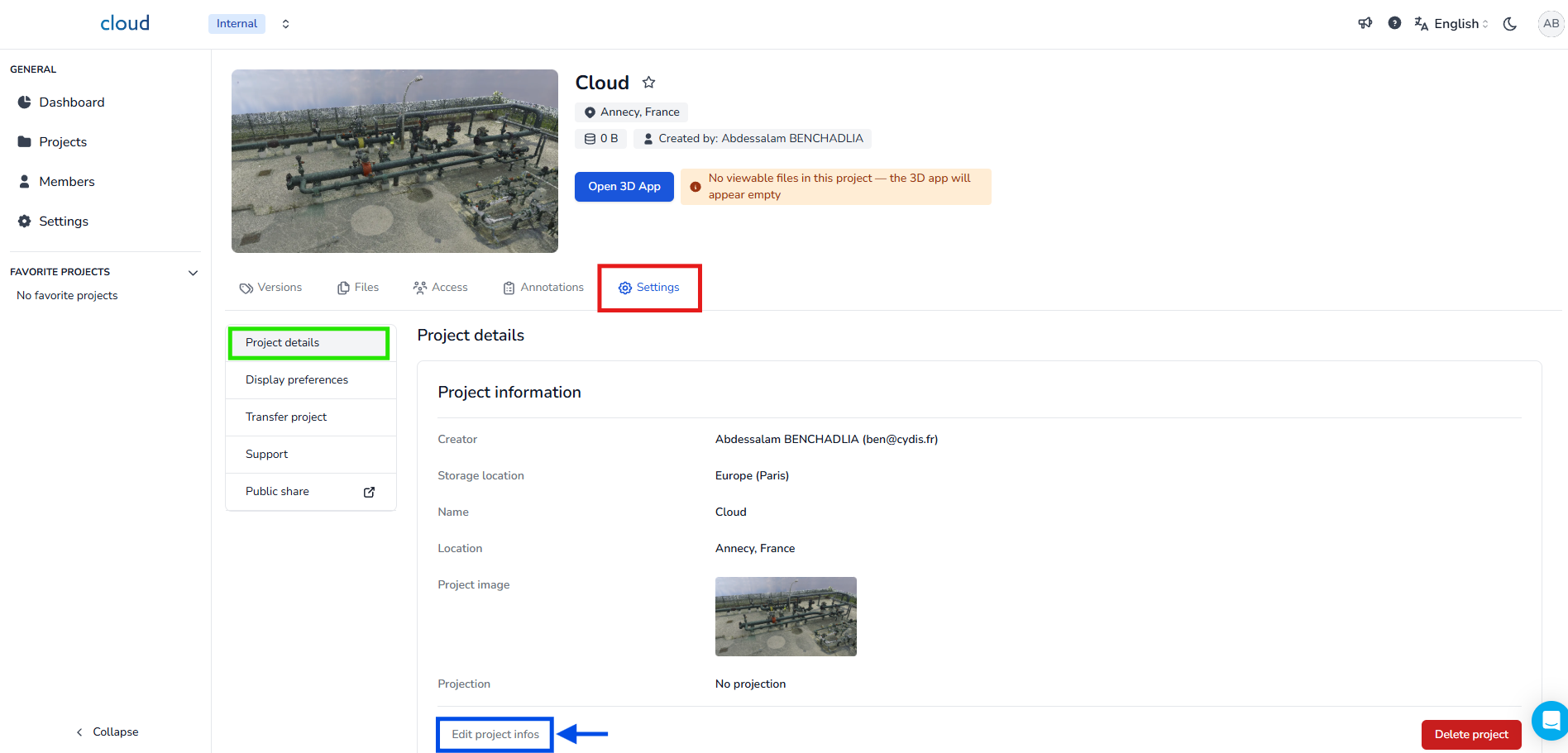 Para atualizar as informações do seu projeto, vá até a aba configurações do seu projeto e selecione a seção detalhes do projeto. Em seguida, clique em editar informações do projeto.