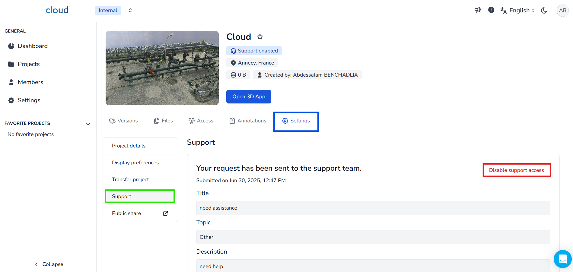 Para ativar o acesso ao suporte para o seu projeto, vá à aba Configurações do projeto e clique em Suporte. Em seguida, pressione o botão Solicitar acesso ao suporte.