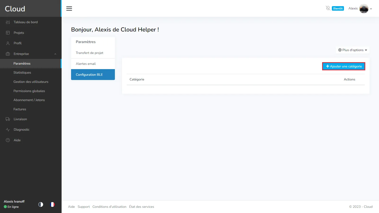 Acesse a Página de Configurações da empresa, e selecione a aba Configuração BLE. Clique no menu à direita e selecione a opção categorias.