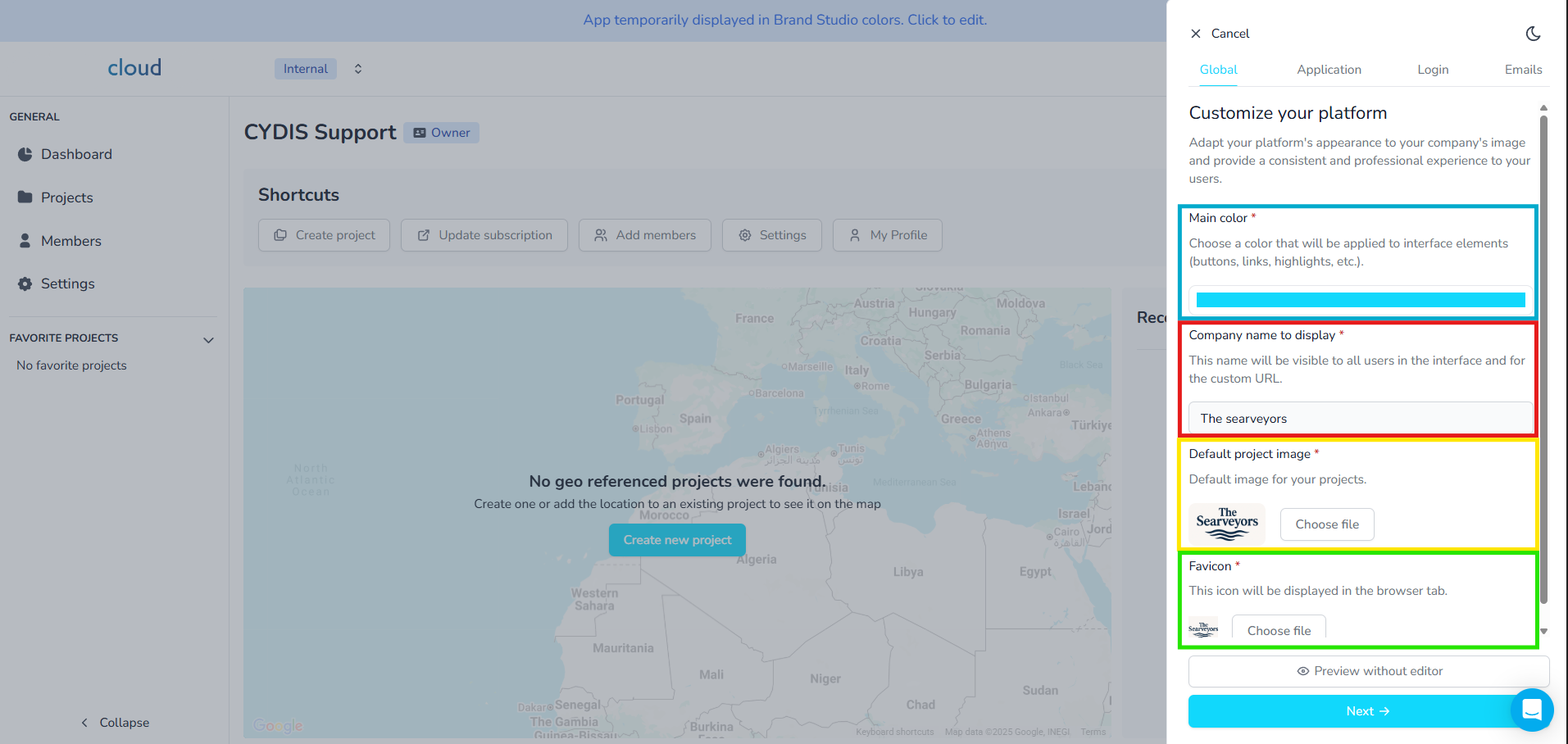 Na aba Global, você pode configurar a identidade visual da sua plataforma: