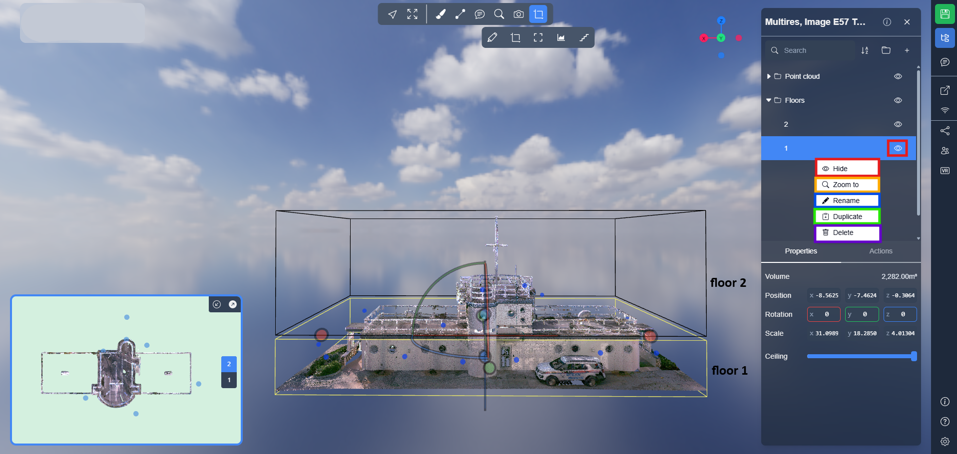 Когда этажи обнаружены, вы можете полностью управлять ими из папки Этажи в вашем списке объектов. Каждый этаж может быть настроен или реорганизован в соответствии с вашими целями навигации и презентации.