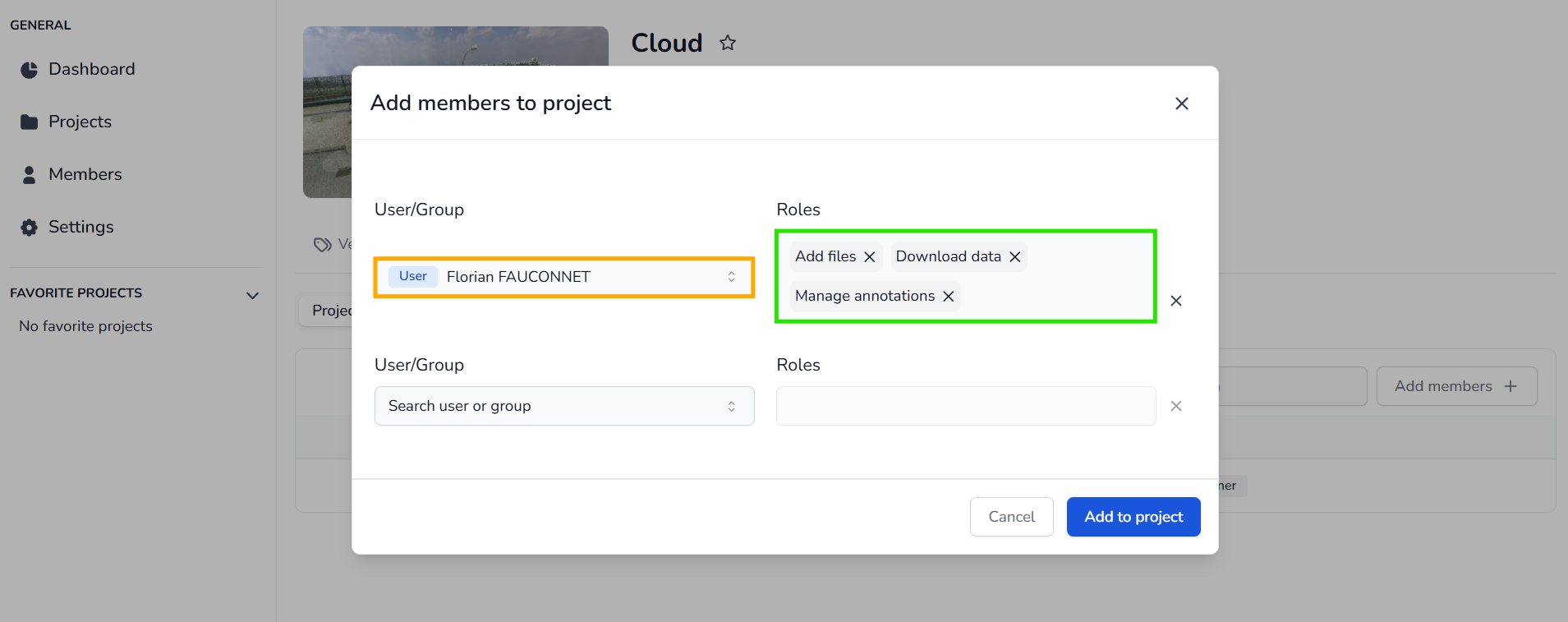 После того как выбранные участник и роль(и) будут выбраны, нажмите Добавить в проект, чтобы подтвердить. Пользователь или группа теперь появится в списке участников с назначенной ролью(ями) рядом с их именем.
