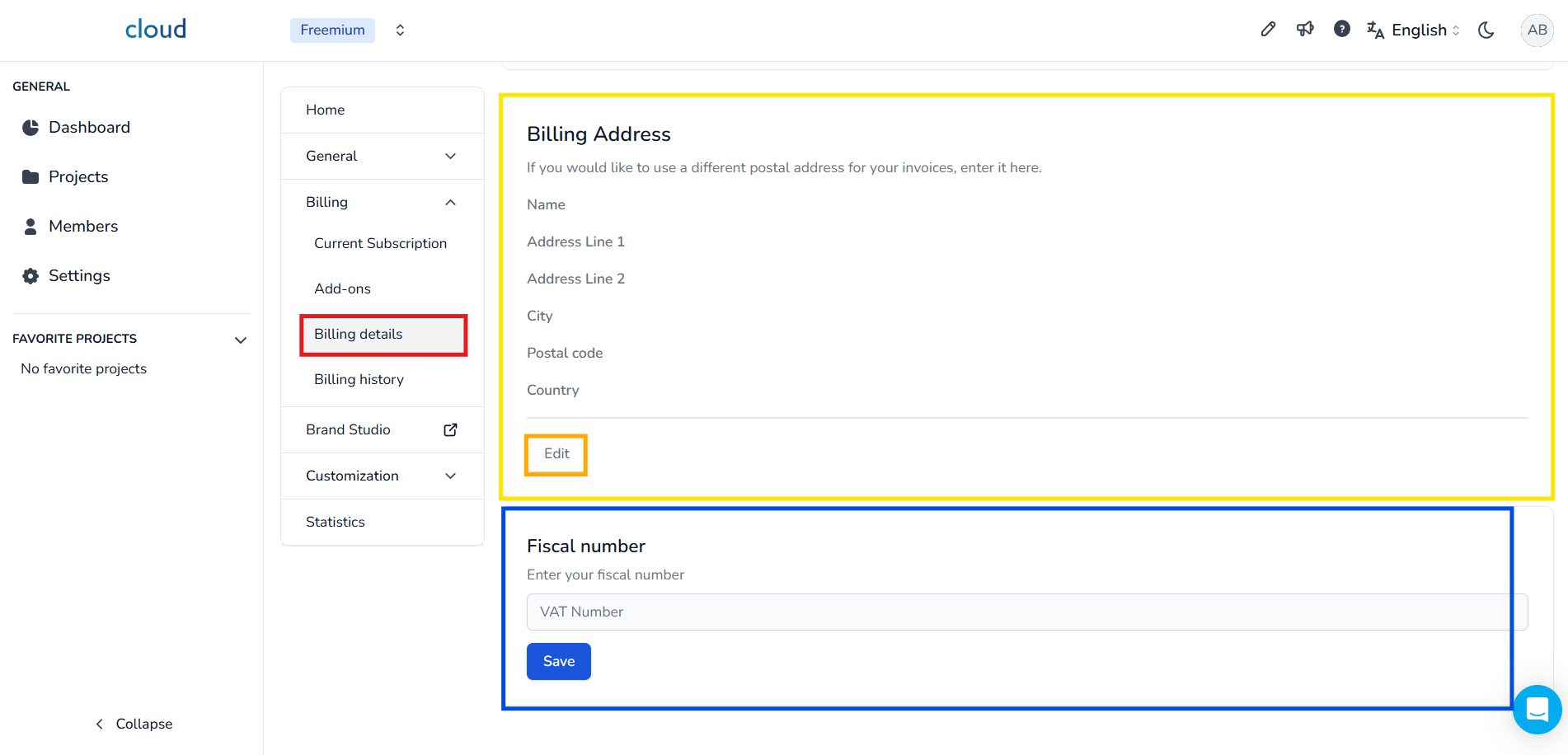 Здесь вам придется ввести вашу информацию для выставления счетов, это классические поля, которые должны быть заполнены вашим названием компании, номером телефона и адресом и по желанию вашим фискальным номером. Это позволяет нам выставлять вам корректные счета, которые могут быть использованы вашими бухгалтерами.