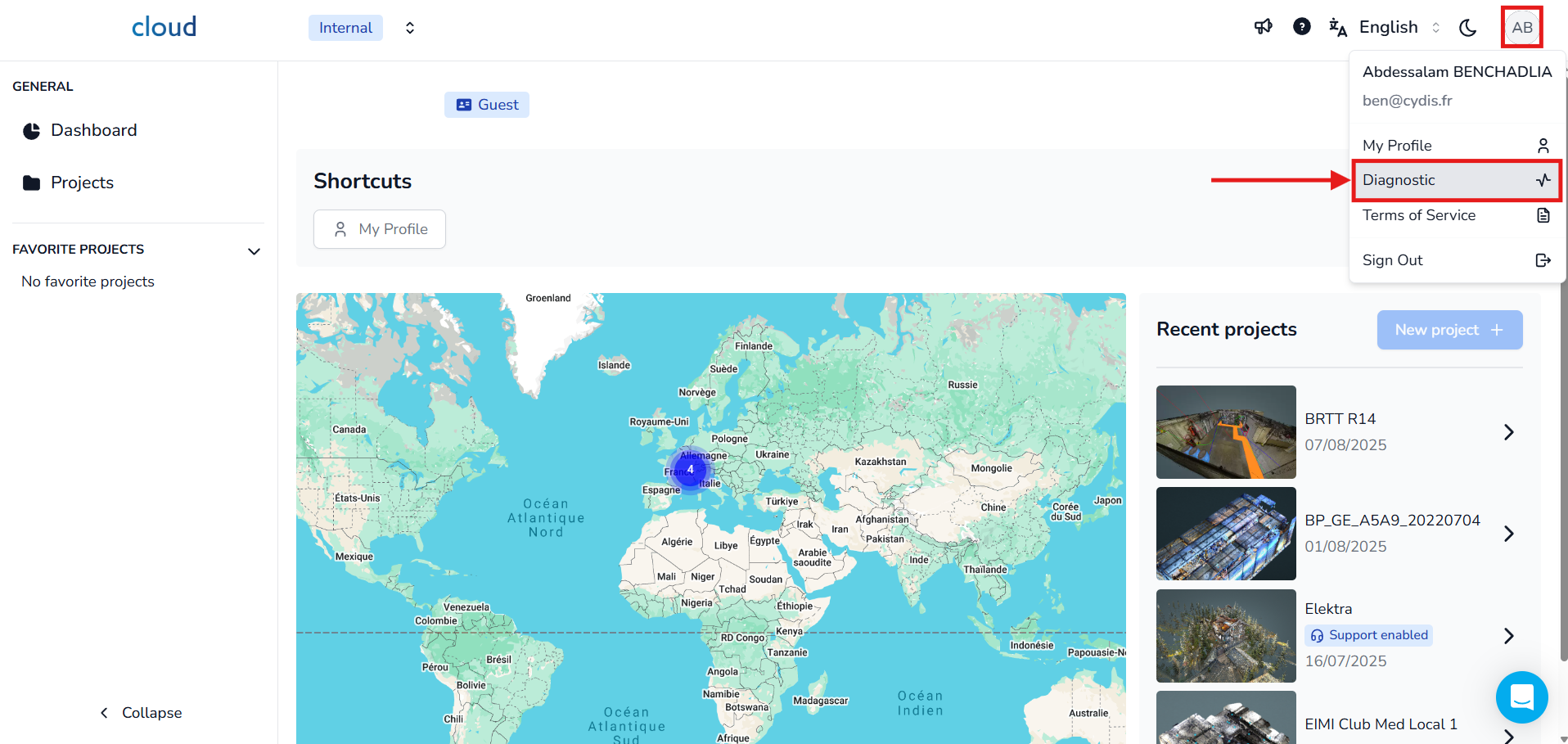 Gå till övre högra hörnet i gränssnittet och klicka på dina profilinitialer för att öppna rullgardinsmenyn. Klicka sedan på avsnittet Diagnostik.