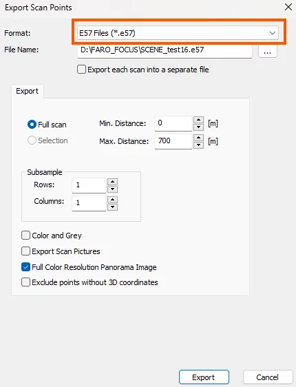 - I fönstret Export Scan Points, välj e57 Files från Format-rullgardinsmenyn. Detta format är idealiskt för att bevara både punktmolnsdata och panoramabilder.