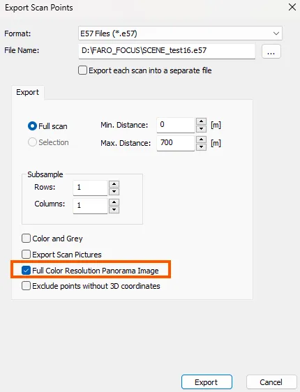 Exportera en e57-fil med 360°-bilder från FARO SCENE