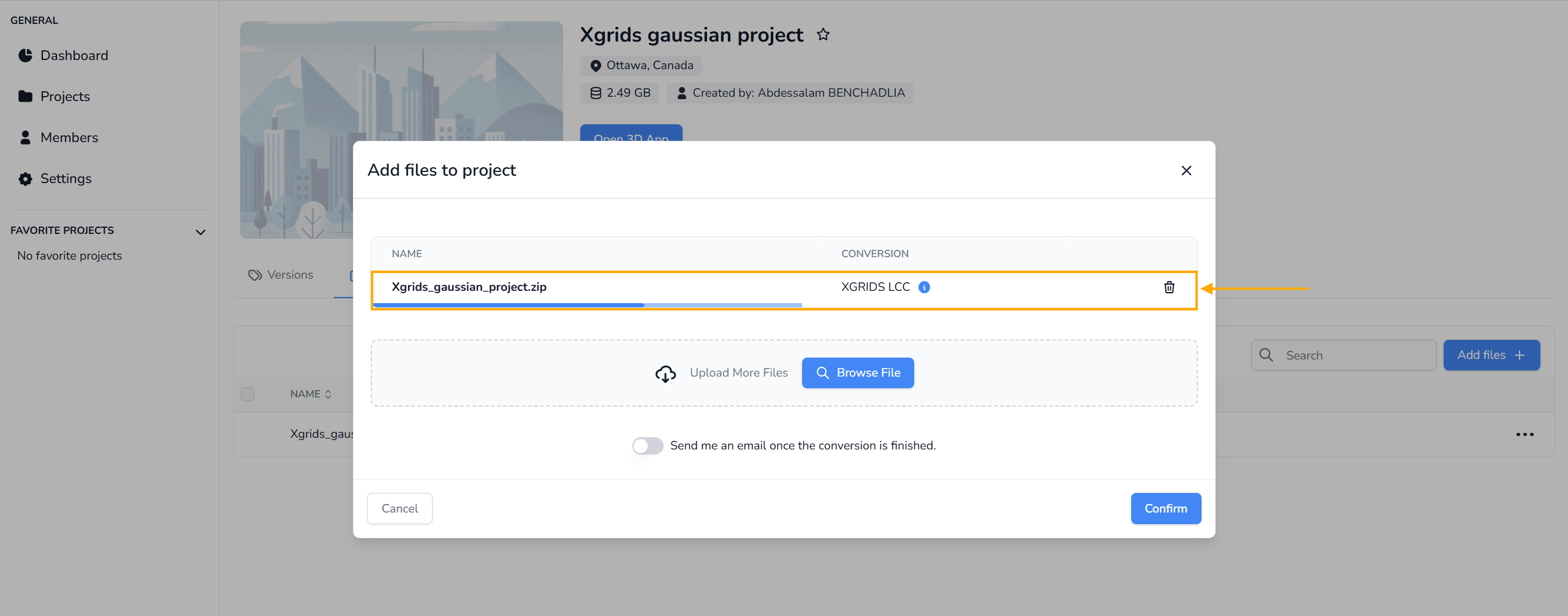 选择文件后,确认上传。如果 ZIP 结构正确,平台将会自动检测到 GRIDS LCC 格式 并开始转换过程。无需手动选择格式。
